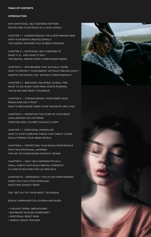 It includes 10 chapters of emotional tools, plus bonus worksheets designed to help you break spirals, set boundaries, and rebuild your inner strength.